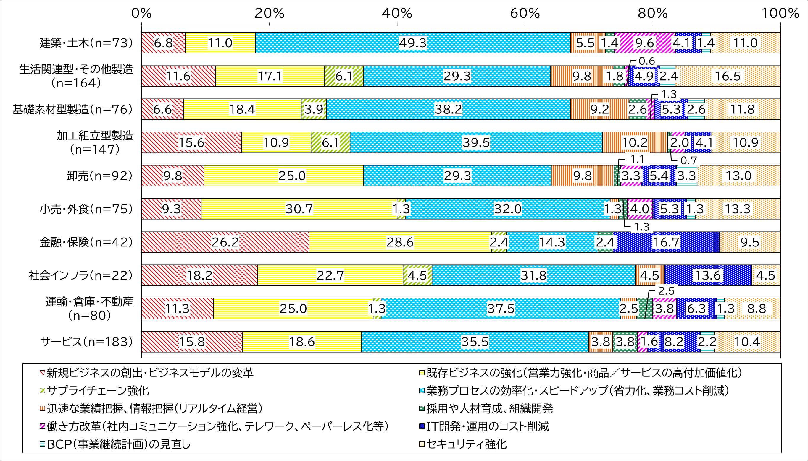 IT投資で解決したい現在直面している経営課題は、全体では「業務プロセスの効率化・スピードアップ」が34.6%で最多です 。しかし業種別に見ると、「建築・土木」では効率化への期待が49.3%と突出する一方、「金融・保険」では「既存ビジネスの強化(28.6%)」や「新規ビジネスの創出(26.2%)」が上位を占めています。各業界が置かれた状況に応じ、ITの活用フェーズを深化させている実態が浮き彫りとなりました。