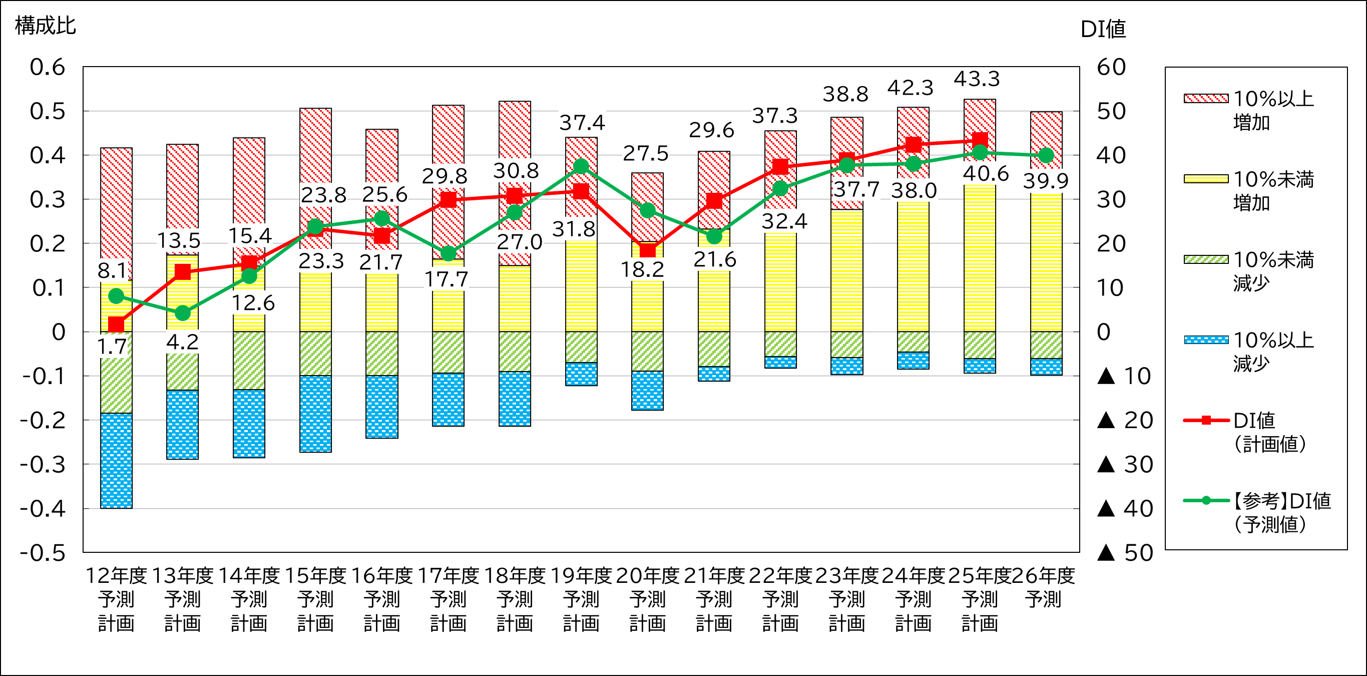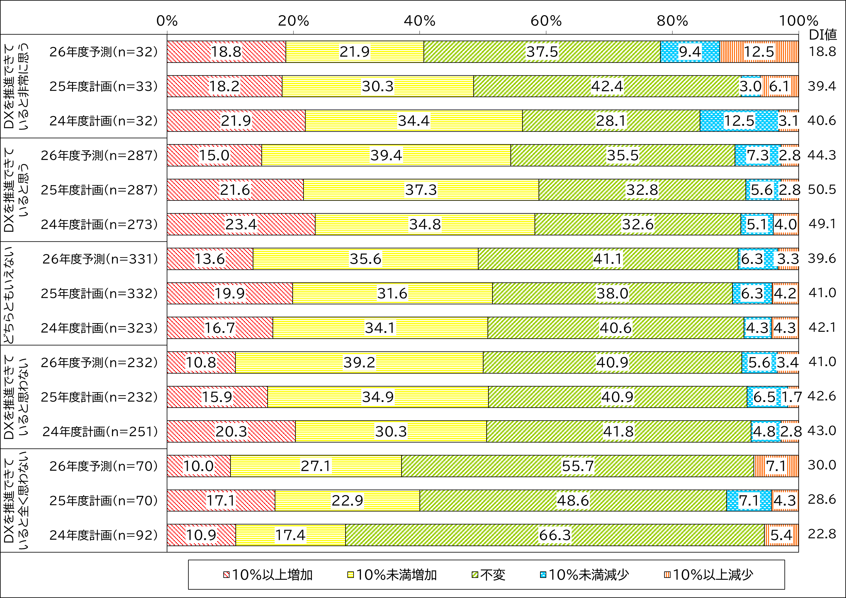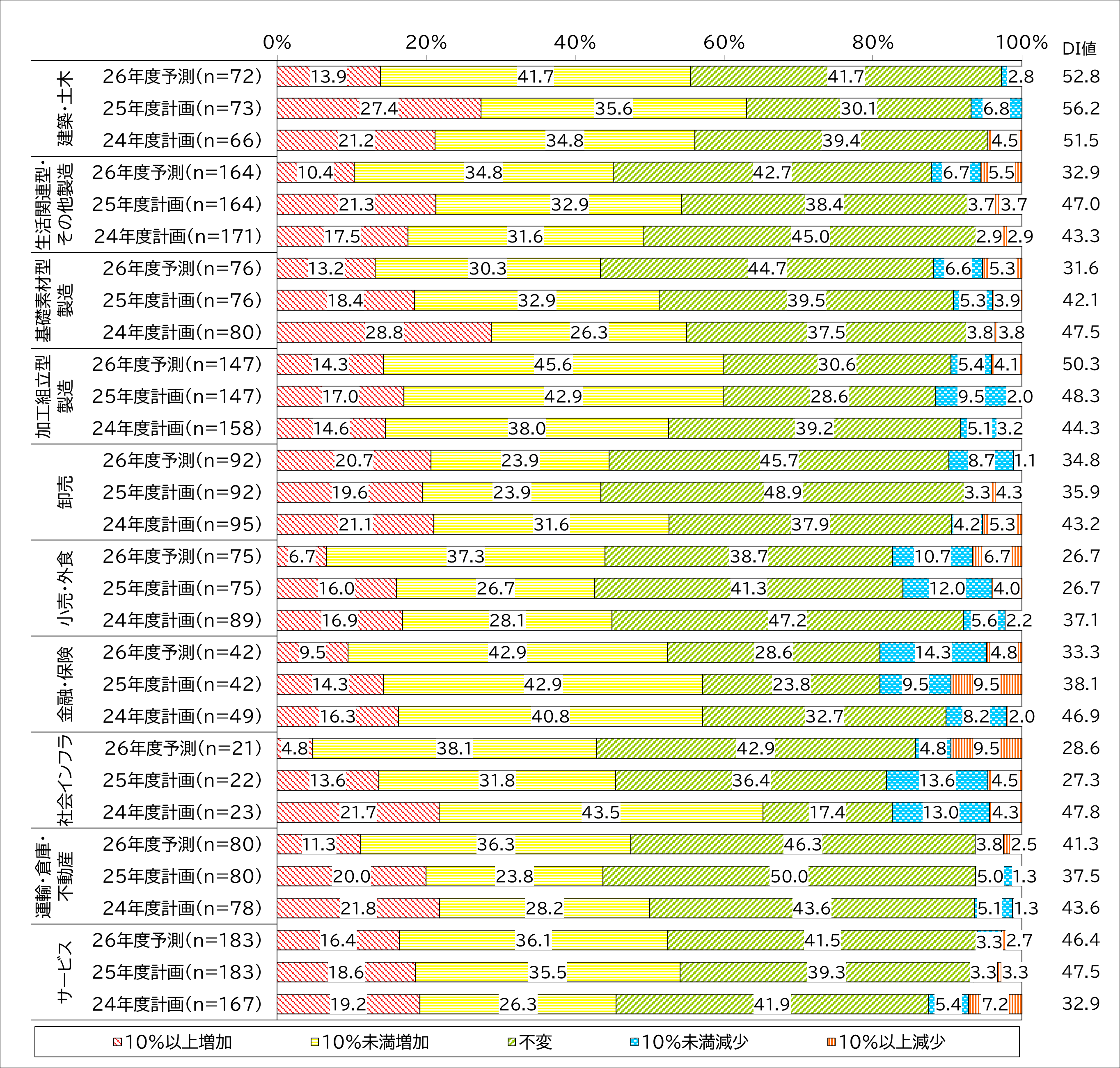業種グループ別では、「建築・土木」のDI値が25年度計画で56.2ポイントと、24年度以降一貫して全業種で最も高い水準を維持しています。また、「サービス」は24年度計画(32.9ポイント)から25年度計画(47.5ポイント)へ14.6ポイント増と、今期最も大きく伸長しました。