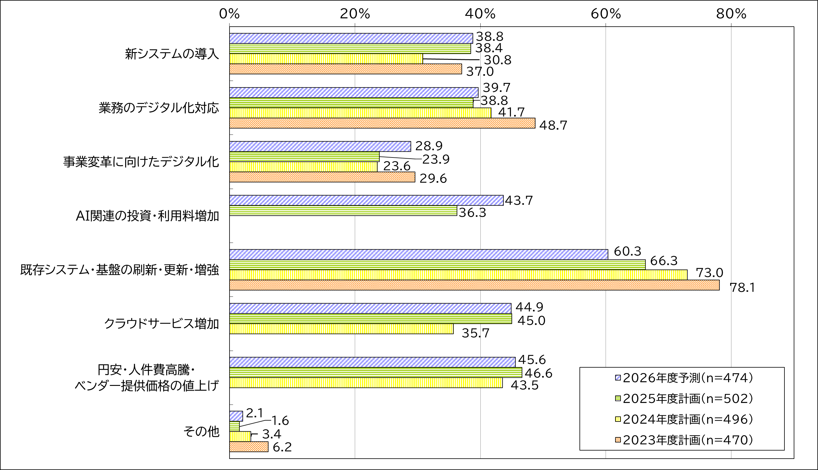 25年度計画においてIT予算が増加した理由は、「既存システム・基盤の刷新・更新・増強」が66.3%と最も高く、次いで「円安・人件費高騰・ベンダー提供価格の値上げ等の影響」が46.6%、「クラウドサービス増加」が45.0%となりました。特筆すべきは、今回から選択肢に追加した「AI関連の投資・利用料増加」です。26年度予測では43.7%(第4位)に達し、25年度計画(36.3%)から7.4ポイントと最も大きな伸びを見せており、近年のAI投資に対する強い意欲がうかがえます。また、DX(デジタルトランスフォーメーション)の広まりからか、「事業変革に向けたデジタル化」をIT投資の増加理由に挙げた割合も5.0ポイント上昇しました。